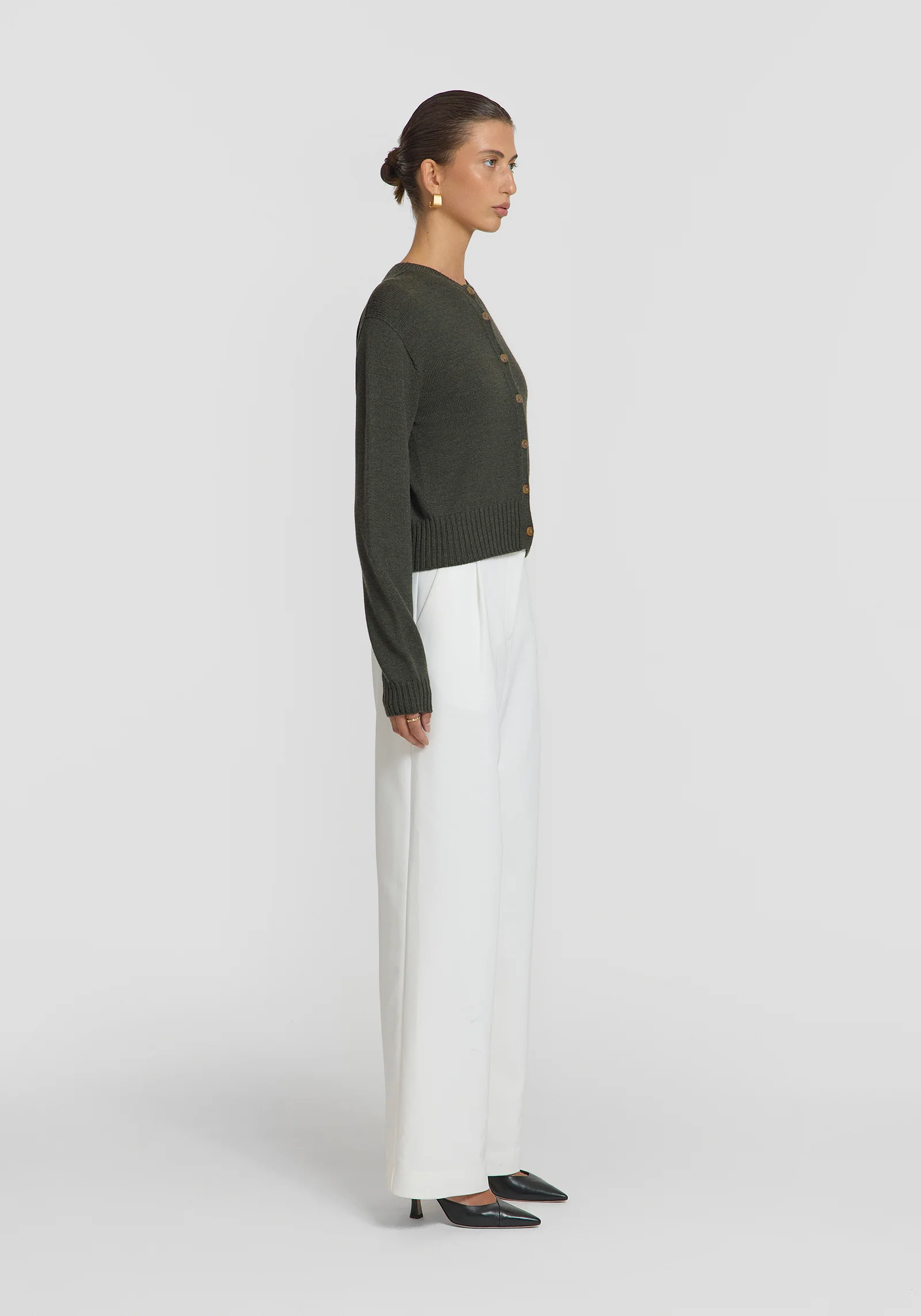 The Ego Cardi returns in a versatile olive green hue, crafted in our signature merino wool. It features a classic jersey stitch with ribbed neckline, cuffs, and hem, along with a button-front closure accented by logo buttons and tonal insignia embroidery. Offering a refined balance of comfort and sophistication, it can be worn buttoned up, layered, or draped over the shoulders to add dimension to your outfitting.