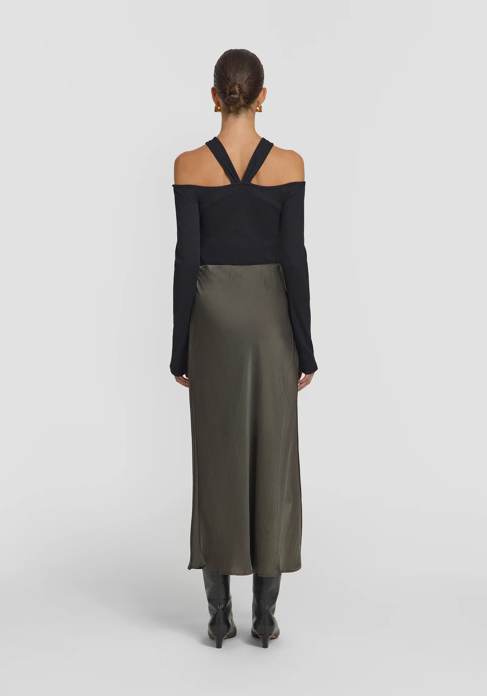 Introducing the Othello Skirt, a sophisticated staple crafted from a cupro blend in a versatile olive green hue. Cut on the bias in a mid-rise, midi-length silhouette, this skirt effortlessly embodies timeless elegance for any occasion. Pair it with this season's olive green offerings for an effortless tonal look, or style it with V&W basics for everyday wear.