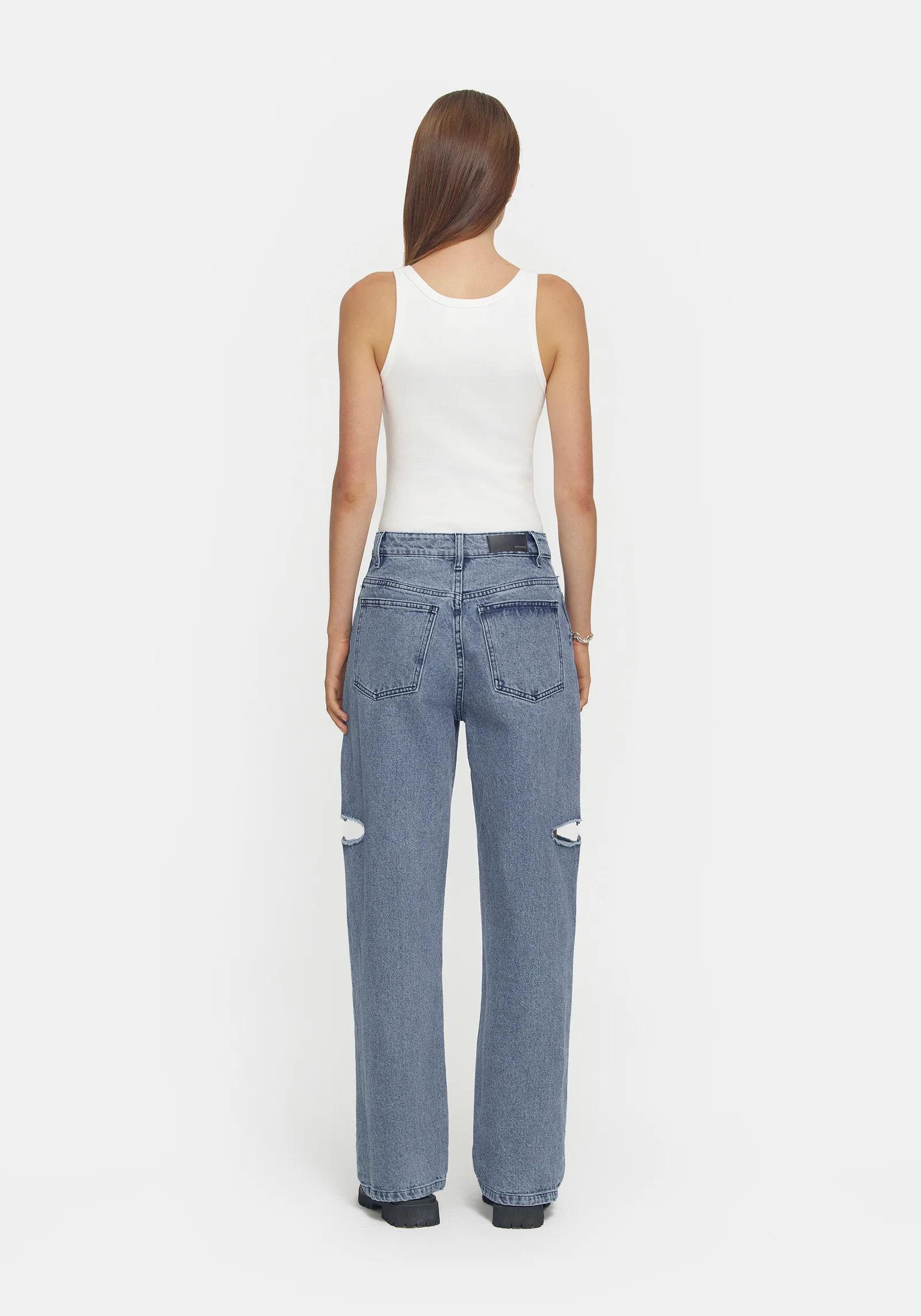 The Prince Jean is your new go-to for everyday denim with a chic edge. Crafted from rigid denim in a vintage wash, it features a flattering high-waisted profile with striking distressed cutouts above the knee, and a black branded leather patch. Whether styled with a ribbed tank for a casual vibe or dressed up with a blazer and heels for a polished look, the Prince Jean effortlessly elevates your wardrobe.