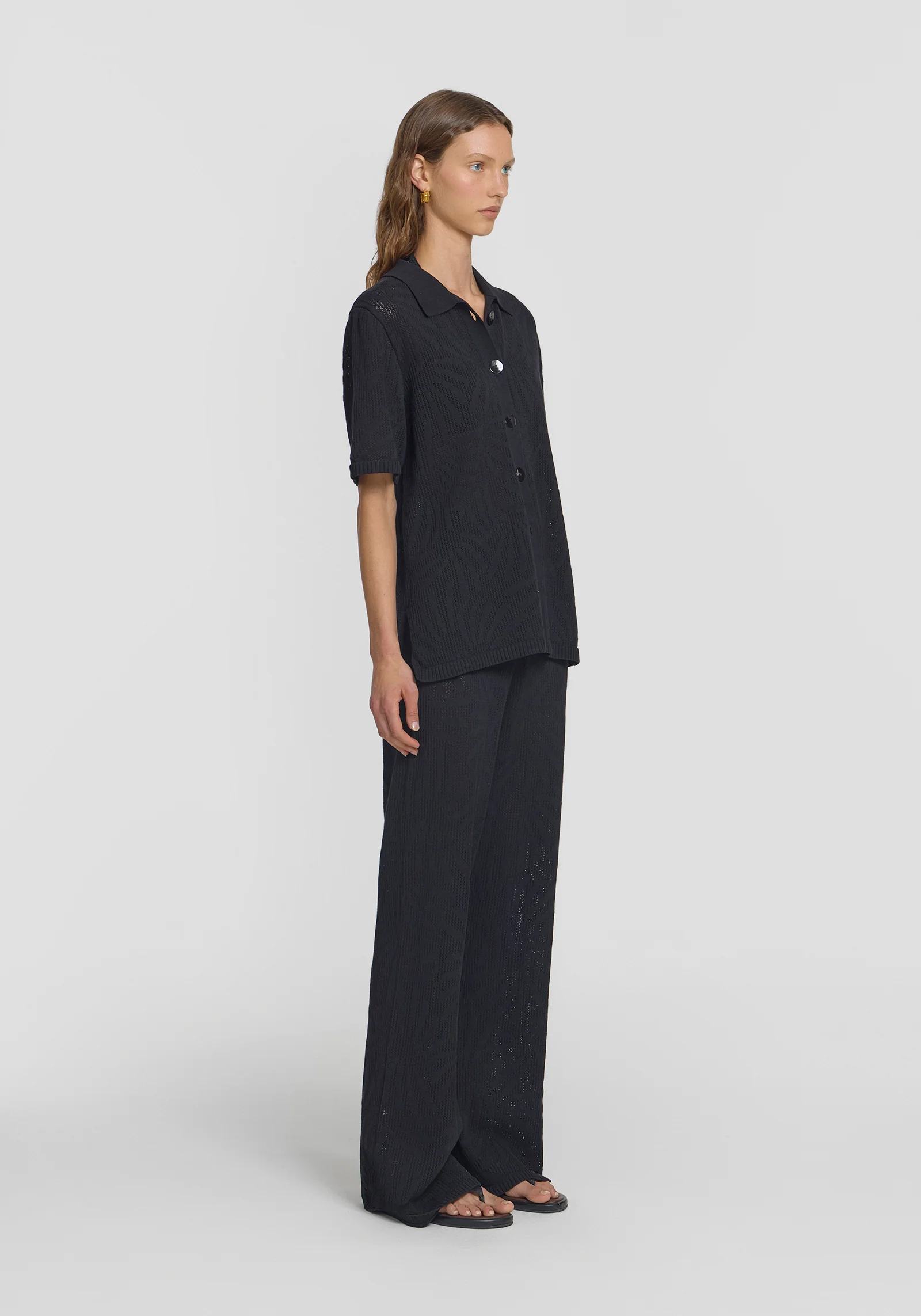 Embrace relaxed refinement with the Valencia Shirt, fully fashioned in organic black cotton and adorned with subtle abstract palm leaf motifs. Featuring a classic centre front placket and traditional collar, it offers a relaxed fit and a hint of sheerness. Pair effortlessly with the Spain Pant for a look of relaxed ease, essential for beachside escapes.